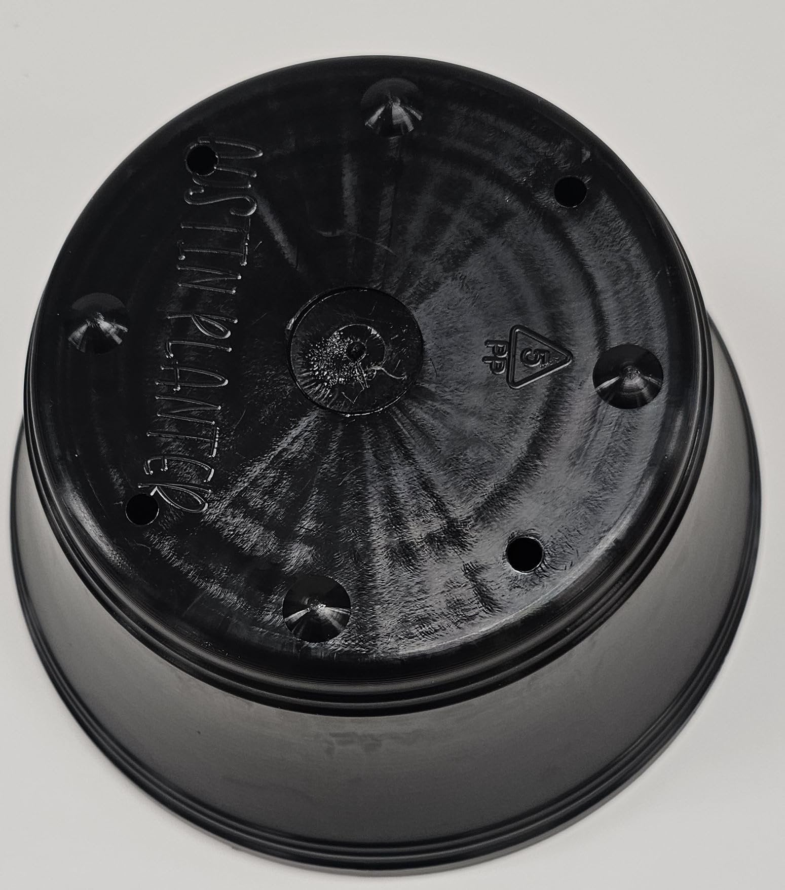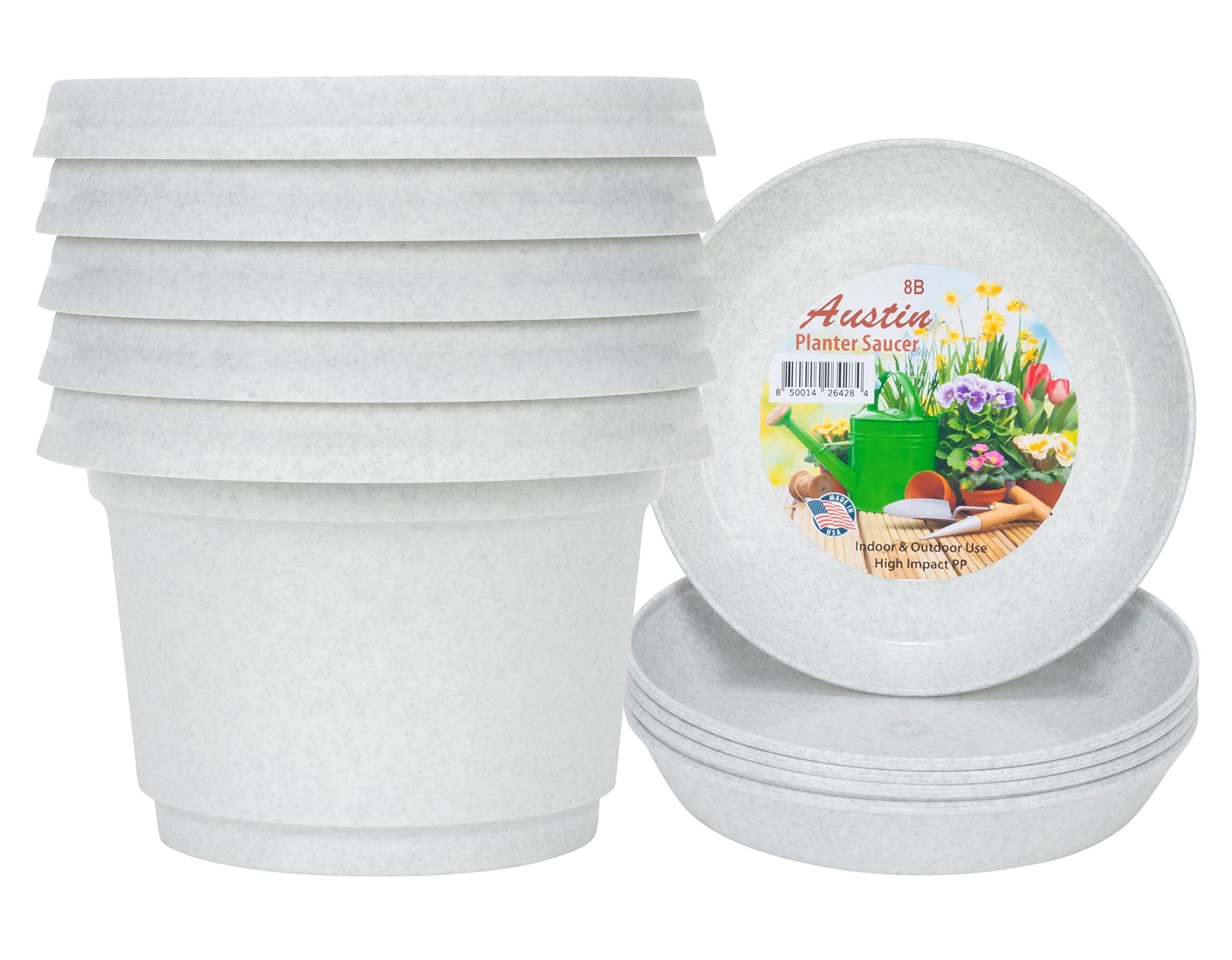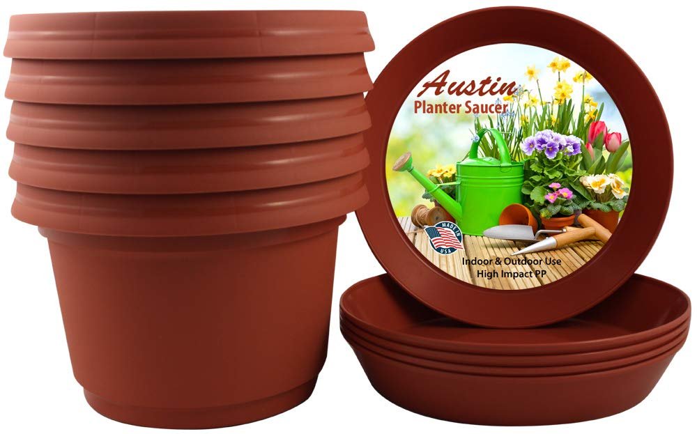The Classic design of these planters and saucers make it a great element for decorative purposes. The color is molded throughout the resin and matches many different decors. Delivered with drainage holes. Lightweight and durable resin construction - weather resistant Made with high impact polypropylene. Can be used indoor or outdoor. The Classic design of this saucer makes it a great element for decorative purposes and works with many different colored pots. The color is molded throughout the resin and matches many different decors. Lightweight and durable resin construction - weather resistant Made with over 90% recycled plastic Can be used indoor or outdoor. The Austin Planter saucer collects excess water drainage and soil spillage from your ceramic or resin pots. The inner surface is flat for the pot or planter to rest evenly. The underside is ribbed to keep the saucer slightly above the flooring surface. Each saucer has a support grid to allow airflow so the floor contact area does not trap moisture under the saucer. Seedling container, seed starter pot, nursery pot & saucer Plastic, durable, colorful flower pot and saucer Planters and saucers, good for DIY projects and crafts Indoor or outdoor, home, yard, patio, terrace, lawn, crafts100% USA made in the USA Made with over 90% recycled plastic Can be used indoor or outdoor. Lightweight and durable resin construction - weather resistant Made with high impact polypropylene