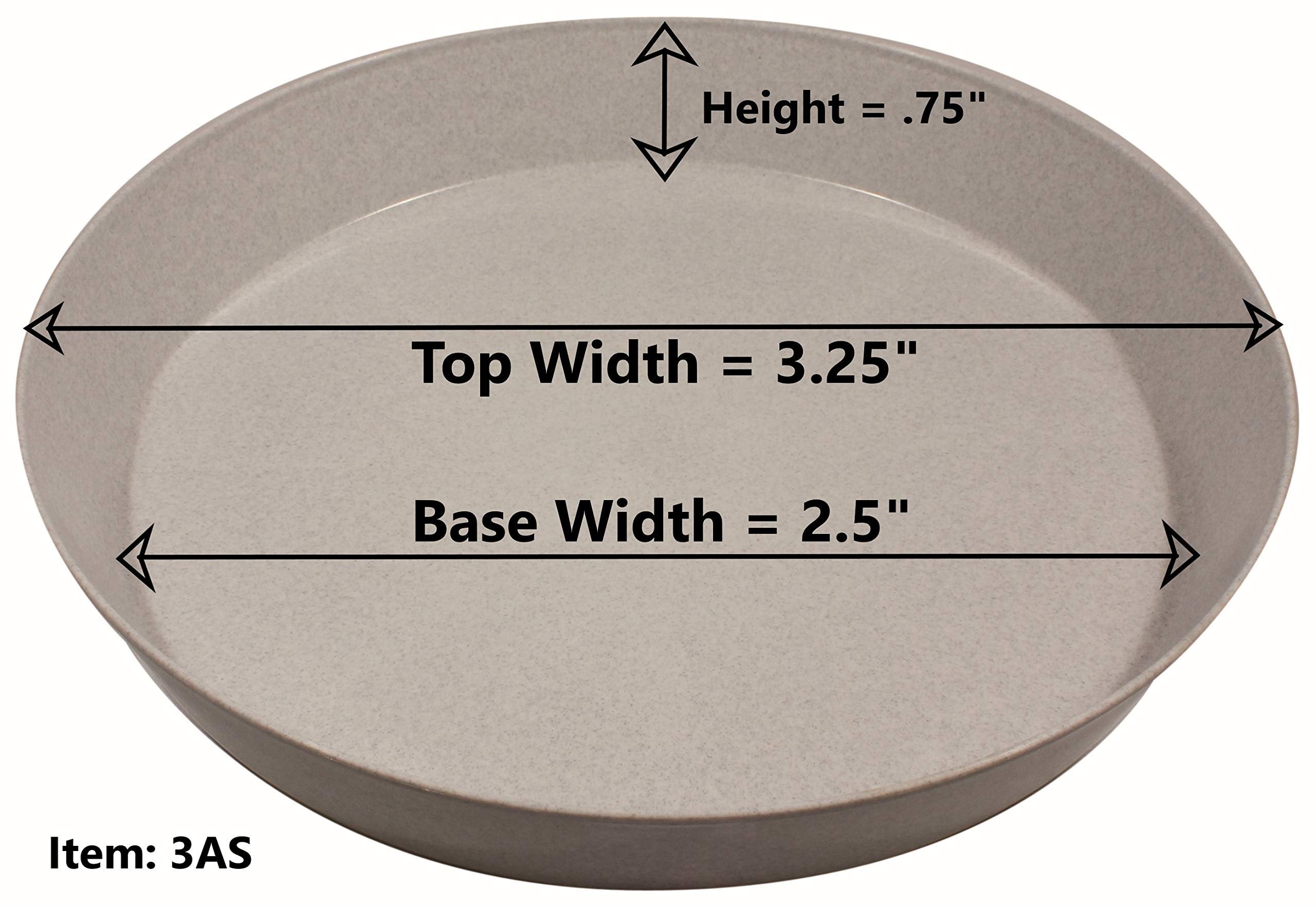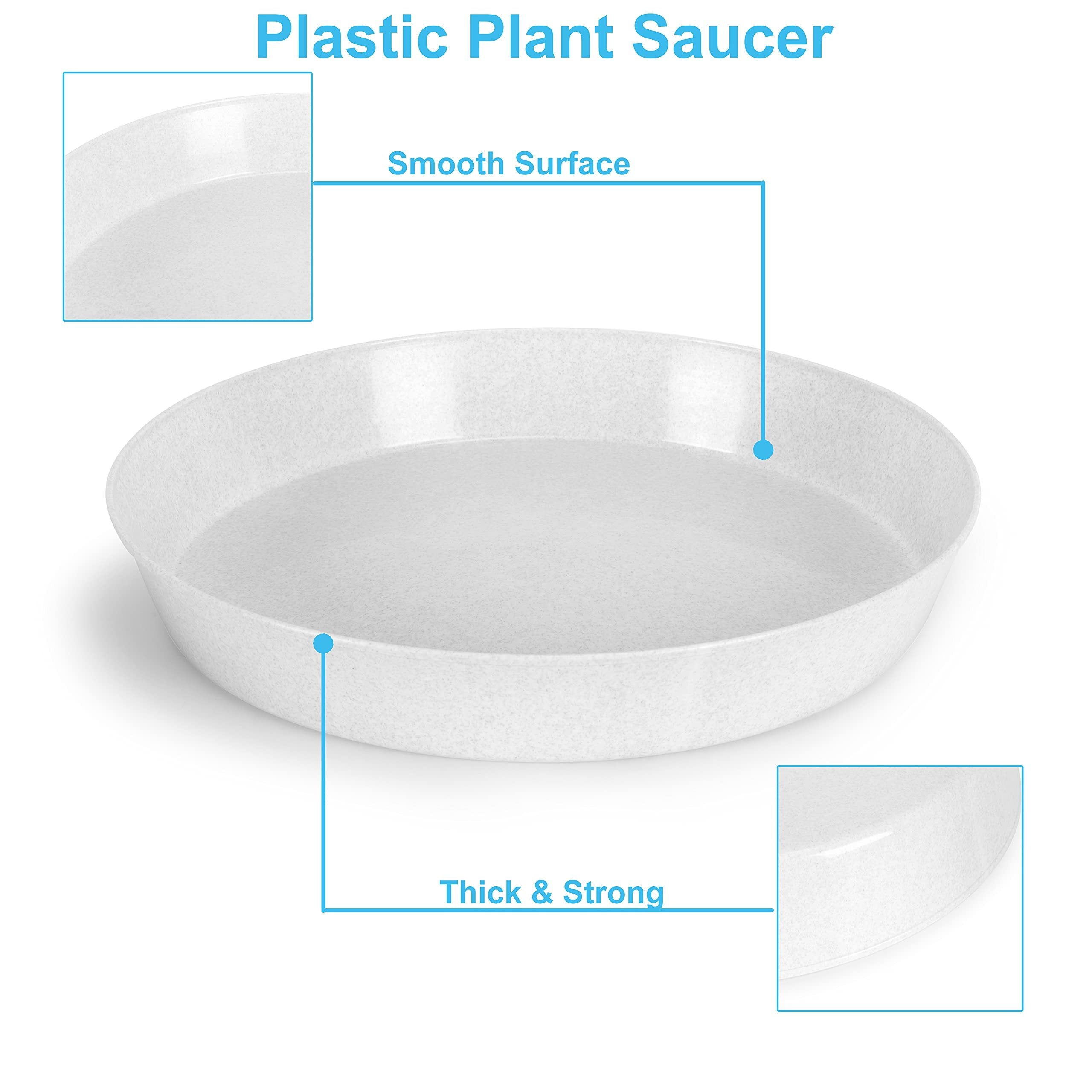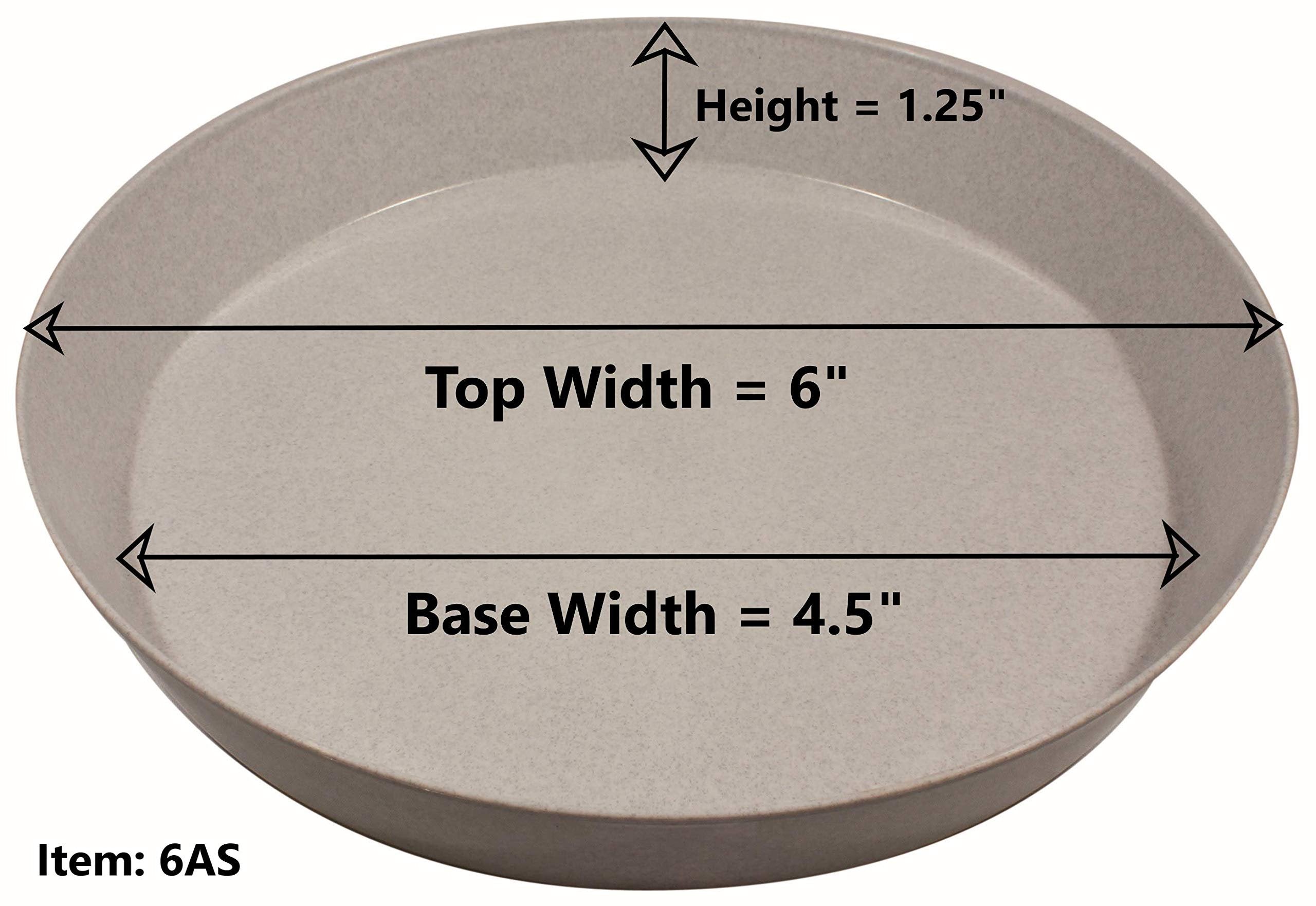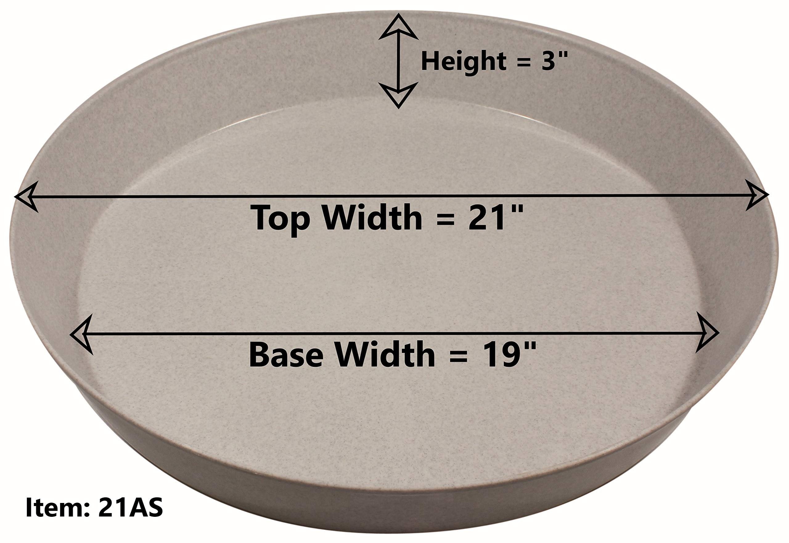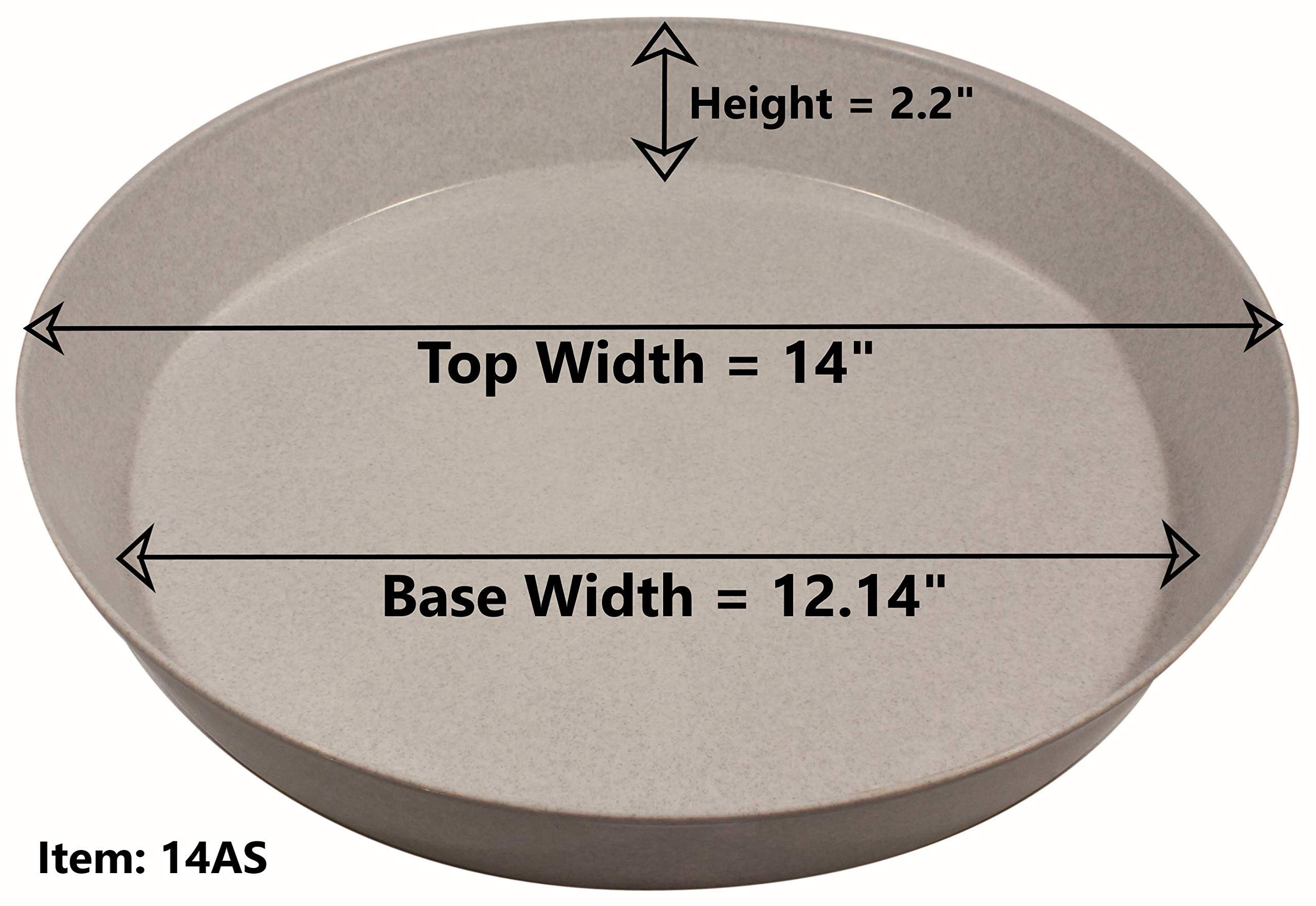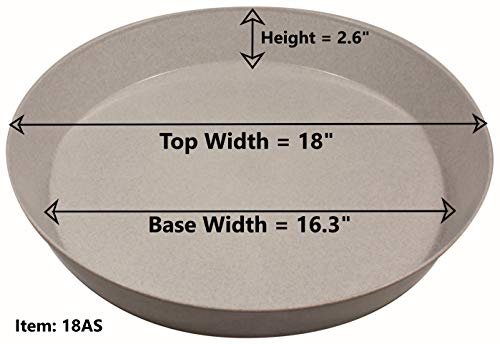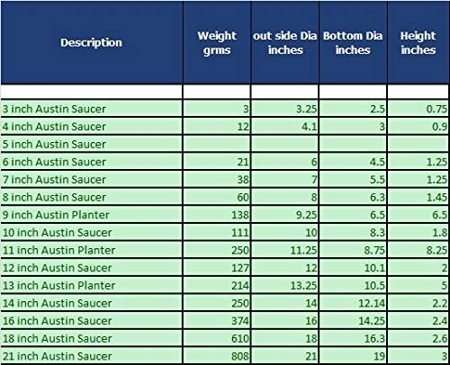 Austin Planters Polypropylene Plant Saucers Multi Pack – Heavy Duty Indoor/Outdoor Tray and Drip Pan – Collects Flower Pot Drainage and Excess Water– Made in USABUY DIRECT FROM THE MANUFACTURER· - HEAVY DUTY PROTECTION – Keep your hardwood floors, carpet, decks and furniture safe from water stains and rings with these thicker and sturdier plant saucers - COLORS AND USES – Granite color which is a gray and white combination with dark mineral grains visible - our saucers work great as flower or plant trays, drip pans, or drainage saucers - DECORATIVE DESIGN – Our saucers are all designed with the home and yard in mind – find the color and finish that best suits your home décor - MADE IN USA – All of our plant trays/saucers are made in the USA using 95% recycled high impact polypropylene which is a strong plastic that is easy to clean - SIZE – Note that a 12 inch saucer is sized for a flower pot that is 12 inches at the top and tapers to the bottom. Make sure you look at the table of sizes to make sure you have the right size. Add about 2 inches to the diameter of the base of your pot to allow for adequate water storage. You can always use a bigger saucer and fill the gap with decorative rocks. Description The Austin Saucer collects excess water drainage and soil spillage from your flower pots. The classic design of these planters and saucers make it a great element for decorative purposes. Protect your hardwood floors, carpets, decks, and furniture from those harmful water stains and rings plants often leave with our sturdy, reusable plant saucers. Thicker and sturdier than most other plastic plant saucers. Our plant saucers are specially made in the USA using 95% recycled high impact polypropylene which is a strong plastic that is easy to clean. The trays are heavy duty enough to hold large and heavy pots but light enough that they’re easy to handle and move. The underside is ribbed to keep saucer slightly above the floor surface to protect your household surfaces. The round shape and flat inner surface allows the pot or planter to rest evenly on nearly all surfaces. It’s the perfect plant drip pan for inside, outside, patio, terrace, yard or household locations. Features and Specifications This package includes 5 plastic plant saucers. The color is molded throughout the resin and matches many different decors. Each flower pot saucer measurements are on the chart provided in the pictures. Carefully read the size on the picture to ensure that our pot trays meet your needs. Note measurements on top of saucers are bigger than bottom measurements. Weight Outside Dia. Inside Dia. Height grams inch inch inch3 inch Austin Saucer 3 3.25 2.5 0.754 inch Austin Saucer 12 4.1 3.0 0.95 inch Austin Saucer 14 4.9 3.9 0.756 inch Austin Saucer 21 6.0 4.5 1.257 inch Austin Saucer 38 7.0 5.5 1.258 inch Austin Saucer 60 8.0 6.3 1.4510 inch Austin Saucer 111 10.0 8.3 1.812 inch Austin Saucer 127 12.0 10.1 2.014 inch Austin Saucer 250 14.0 12.14 2.216 inch Austin Saucer 374 16.0 14.25 2.418 inch Austin Saucer 610 18.0 16.3 2.621 inch Austin Saucer 808 21.0 19.0 3.0Bullet 1AUSTIN PLANTER saucers are high quality manufacturedplant pots saucers which are environmentally friendly, recyclable and a must toprotect furniture and floors from becoming stained from soil spills and overwatering. Perfect for indoor andoutdoor use. The AUSTIN PLANTER saucer will not fade and can be washed andreused over and over. They are dishwasher safe too. Bullet2Neverworry about excess water or soil overflow that contaminates your floor orfurniture! Our AUSTIN PLANTER saucer is perfect for placing underneath indoorplanters and it will catch excess drainage water and protect your householdsurfaces from water damage. Great for indoor use when a plant needs to be movedfor any reasons such as insufficient sunlight.Bullet3TheAUSTIN PLANTER saucer allows your planters to drain out excess water to preventoverwatering. Water drains freely, and provides critical airflow for healthyroot aeration, helping your precious plants grow stronger.The AUSTIN PLANTER saucer’s durable plasticconstruction provides stability for planters and allows plants to be movedeasily. And you could use the extra spaces to display stones or marbles to addbeauty to your plants. Perfect for indoor and outdoor use.Bullet 4In order to choose the correct sized saucer, please measure the diameter of thebottom of the pot, and then choose a pot with a diameter larger than themeasured size. The best way to find the correct saucer is to turn the flowerpot overand measure the bottom diameter. Select a saucer with base diameter about 2inches larger - Austin Planter saucers are flat on the inside so you can useany size pot that fits the saucer and even several small pots in one saucer.Carefully Read the Size Information BeforeMaking a Decision. Note that the top and bottom dimensions of the flower potsaucer are different.Bullet5Ourplastic trays are specially made of premium new PP Plastic material, solid,durable, sunlight-resistant and fall-resistant, thicker and stronger thanothers, Thisplanter tray made of lightweight and heavy-duty PP material, highquality and low price, suitable for various indoor and outdoor uses.Bullet 6Why is pp (polypropylene) better thanPVC (vinyl)? Polypropylene is one of the most neutral plastics, containingonly two elements in its basic structure: carbon (C) and hydrogen (H).PVC by comparison contains Chlorine (Cl) in its basic structure. When PVC isincinerated or present in accidental fires it can produce toxic byproducts suchas dioxins, chlorocarbons and hydrochloric acid. Complete combustion of PP, onthe other hand, will generate only carbon dioxide and water. PP is much more tolerant to heat; even underextreme conditions it will only decompose to lower molecular weight paraffins,which are elementally compatible with the base material.Bullet 7Help keep plants moist longer and maintain a cleaner garden, ensuring your favorite 