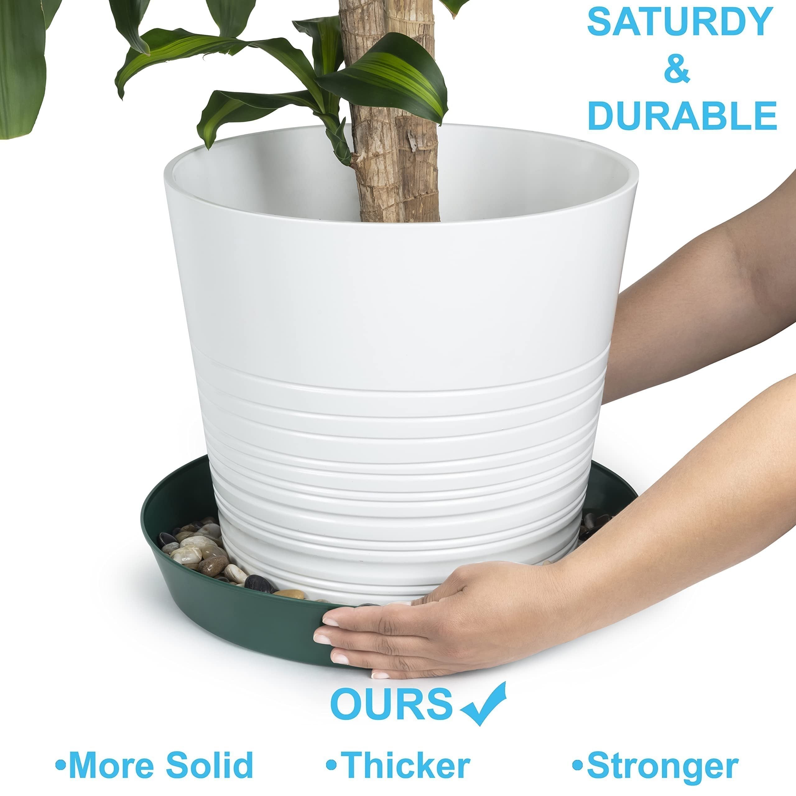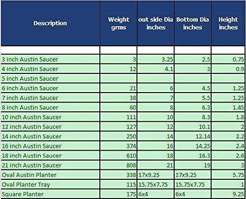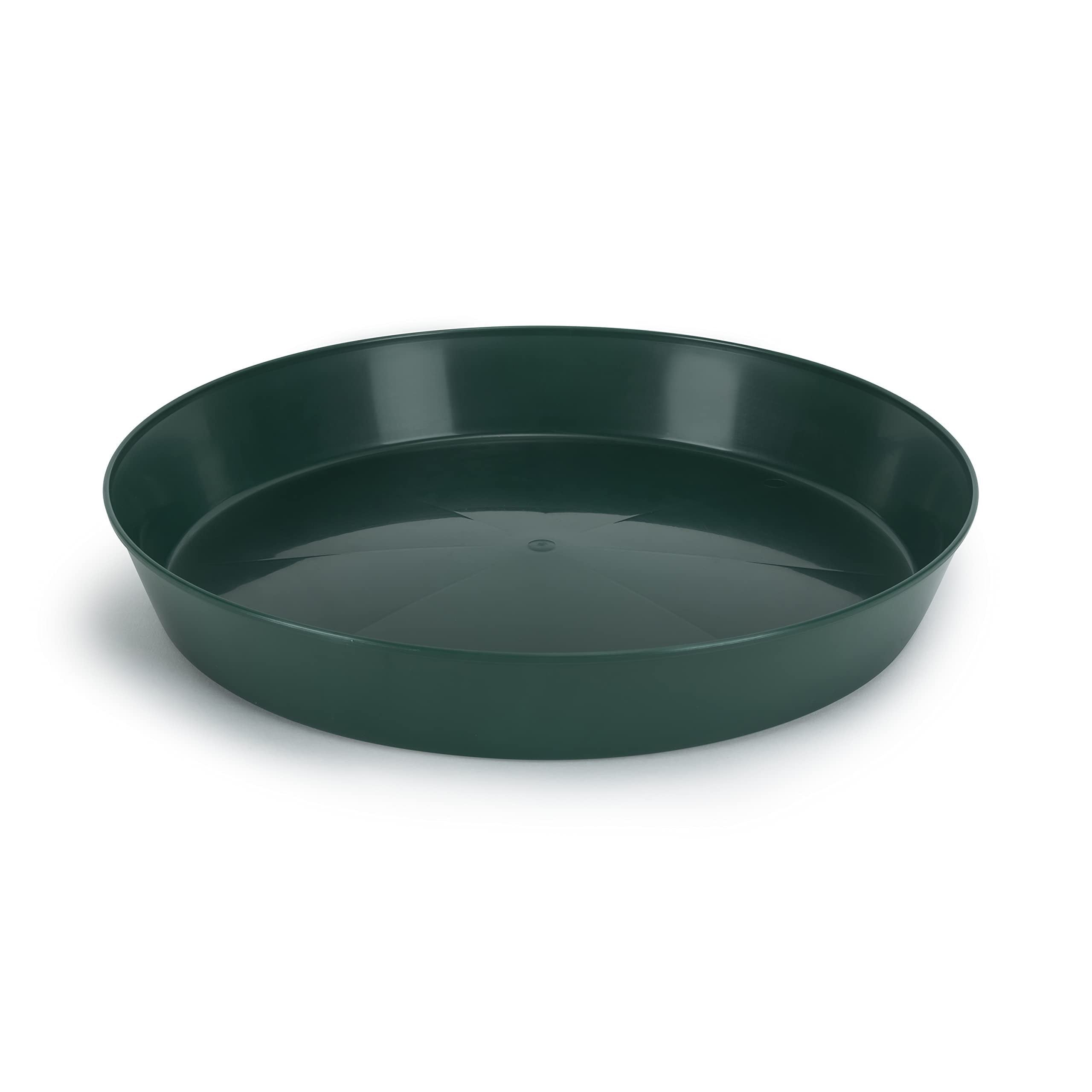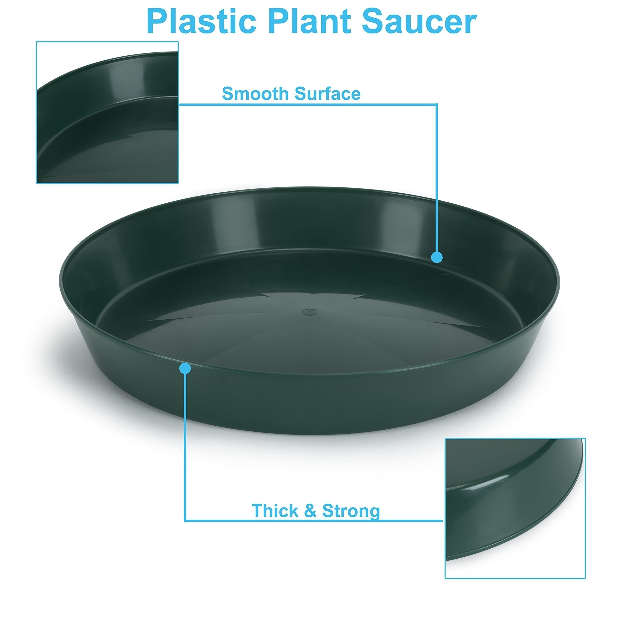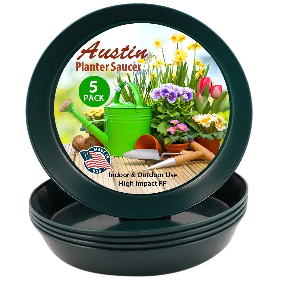 The Austin Planter Saucer, a versatile and durable plant drip pan designed to collect excess water drainage and soil spillage from flower pots. The saucers are made in the USA. Using 95% recycled high impact polypropylene, an Eco-friendly, long-lasting, color retaining plastic. They are designed to protect any surface, hardwood floors, carpets, decks, and furniture providing protection against water stains and rings. Their underside is ribbed to keep the saucer slightly raised above the floor. The round shape and flat inner surface allow the pot or planter to rest evenly on nearly all surfaces. They are weather-resistant, dishwasher safe making it possible to reuse the saucers over and over. The large sides also allow plants to drain out excess water, provide airflow for healthy root aeration, and add beauty to plants. Overall, these plant saucers are a great addition to any indoor or outdoor home décor, they can be used for decorative purposes using colorful pebbles, stones or marbles, adding beauty to plants. They are suitable for various uses including flower pots, drip pans, and drainage saucers. They are great for serving trays, under a propane tank by the grill, under the Christmas tree or a water dish for your pets. Austin Planter Saucers also make a great tray for your remotes, serving food or even a paper plate holder. The saucers come in many sizes, 3-4-5-6-7-8-10-12-14-16-18-21 inches, making it easy to find a saucer that is the correct size for your pot or several small pots in one of the larger Austin Planter saucers. They are lightweight and heavy-duty, making them easy to handle and move. Our various color choices make it easy to matches any pot color; ceramic, clay, and plastic. To choose the correct size, measure the bottom diameter of the pot and select a saucer with a base diameter about 2 inches larger.Made in the USA Of 95% Recycled Eco-friendly PolypropyleneVarious Uses Including Flower Pots, Drip Pans, and Drainage Saucers.Provides Protection Against Water Stains and Rings on Surfaces Like Hardwood Floors, Carpets, Decks, and Furniture.Round Shape and Flat Inner Surface Allow Pots to Rest Evenly on Nearly All Surfaces.Large sides allow plants to drain excess water, provide airflow for healthy root aeration, and add beauty to plants.made in the USAMade with over 90% recycled plasticCan be used indoor or outdoor.Lightweight and durable resin construction - weather resistant Made with high impact polypropylene