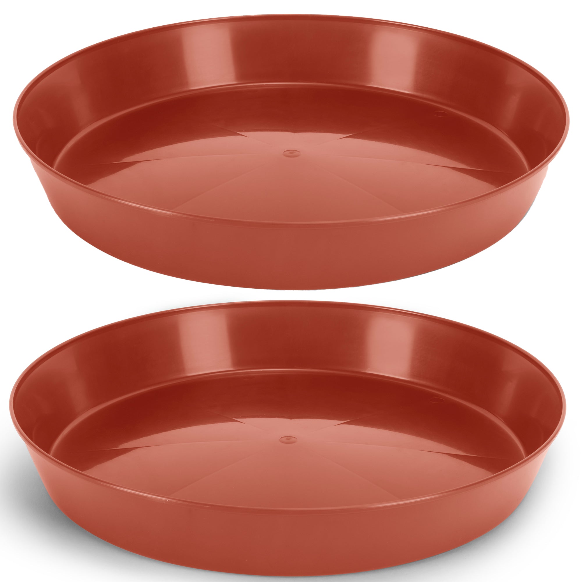 The Austin Saucer collects excess water drainage and soil spillage from your flower pots. The classic design of these planters and saucers make it a great element for decorative purposes. Protect your hardwood floors, carpets, decks, and furniture from those harmful water stains and rings plants often leave with our sturdy, re-usable plant saucers. Our plant saucers are specially made in the USA using high impact polypropylene which is a strong plastic that is easy to clean. The trays are heavy duty enough to hold large and heavy pots but light enough that they are easy to handle and move. The underside is ribbed to keep saucer slightly above the floor surface to protect your household surfaces. The round shape and flat inner surface allows the pot or planter to rest evenly on nearly all surfaces. It is the perfect plant drip pan for inside, outside, patio, terrace, yard or household locations. Features and Specifications The color is molded throughout the resin and matches many different decors. Each flower pot saucer measurements are on the chart provided in the pictures. Carefully read the size on the picture to ensure that our pot trays meet your needs. Note measurements on top of saucers are bigger than bottom measurements. Made in the USA Of 95% Recycled Eco-friendly Polypropylene. Various Uses Including Flower Pots, Drip Pans, and Drainage Saucers. Provides Protection Against Water Stains and Rings on Surfaces Like Hardwood Floors, Carpets, Decks, and Furniture. Round Shape and Flat Inner Surface Allow Pots to Rest Evenly on Nearly All Surfaces. Large sides allow plants to drain excess water, provide airflow for healthy root aeration, and add beauty to plants. Made in the USA Made with over 90% recycled plastic Can be used indoor or outdoor. Lightweight and durable resin construction - weather resistant Made with high impact polypropylene